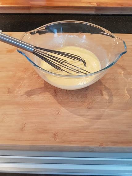 Mélanger ensemble la farine ,le sucre ,les oeufs et le beurre ou margarine fondu.