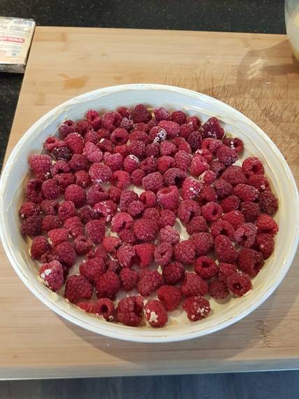 Beurrer un plat à tarte allant au four puis mettre vos framboises et y ajouter votre pâte .